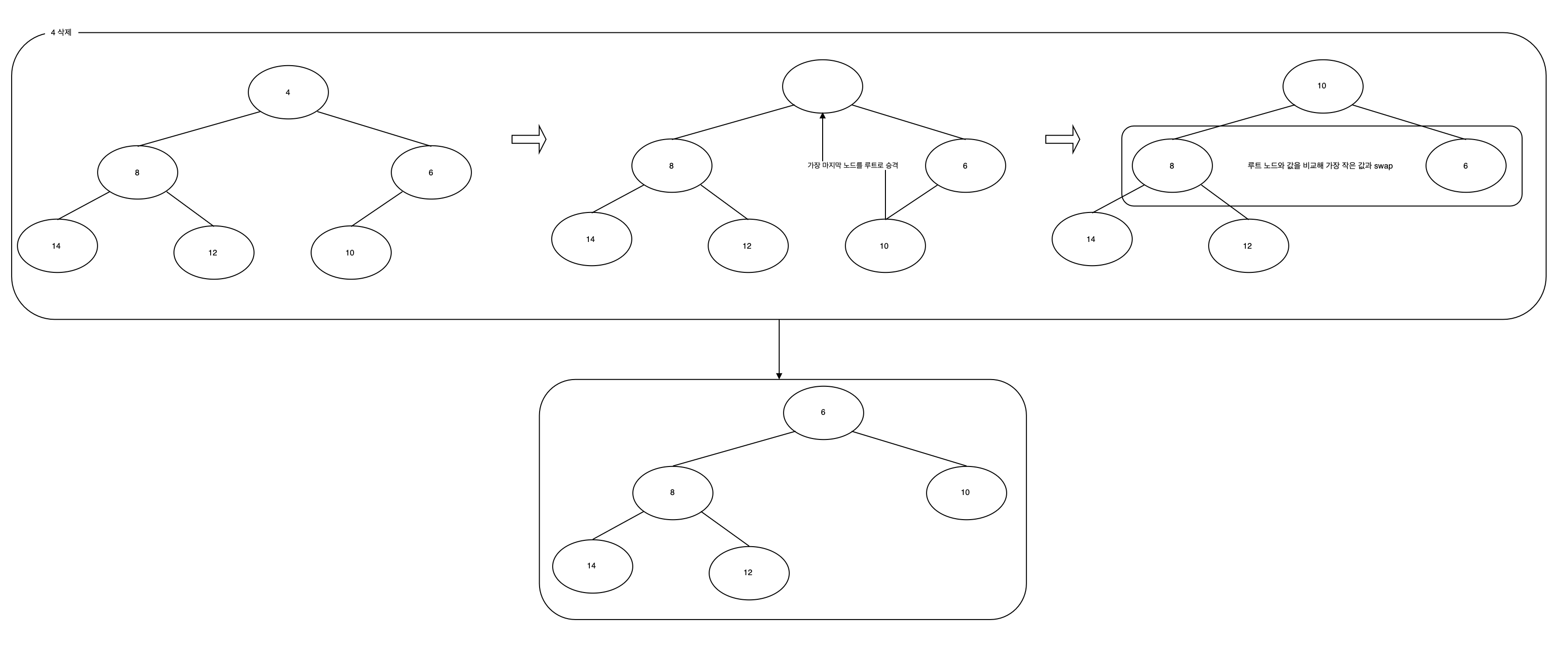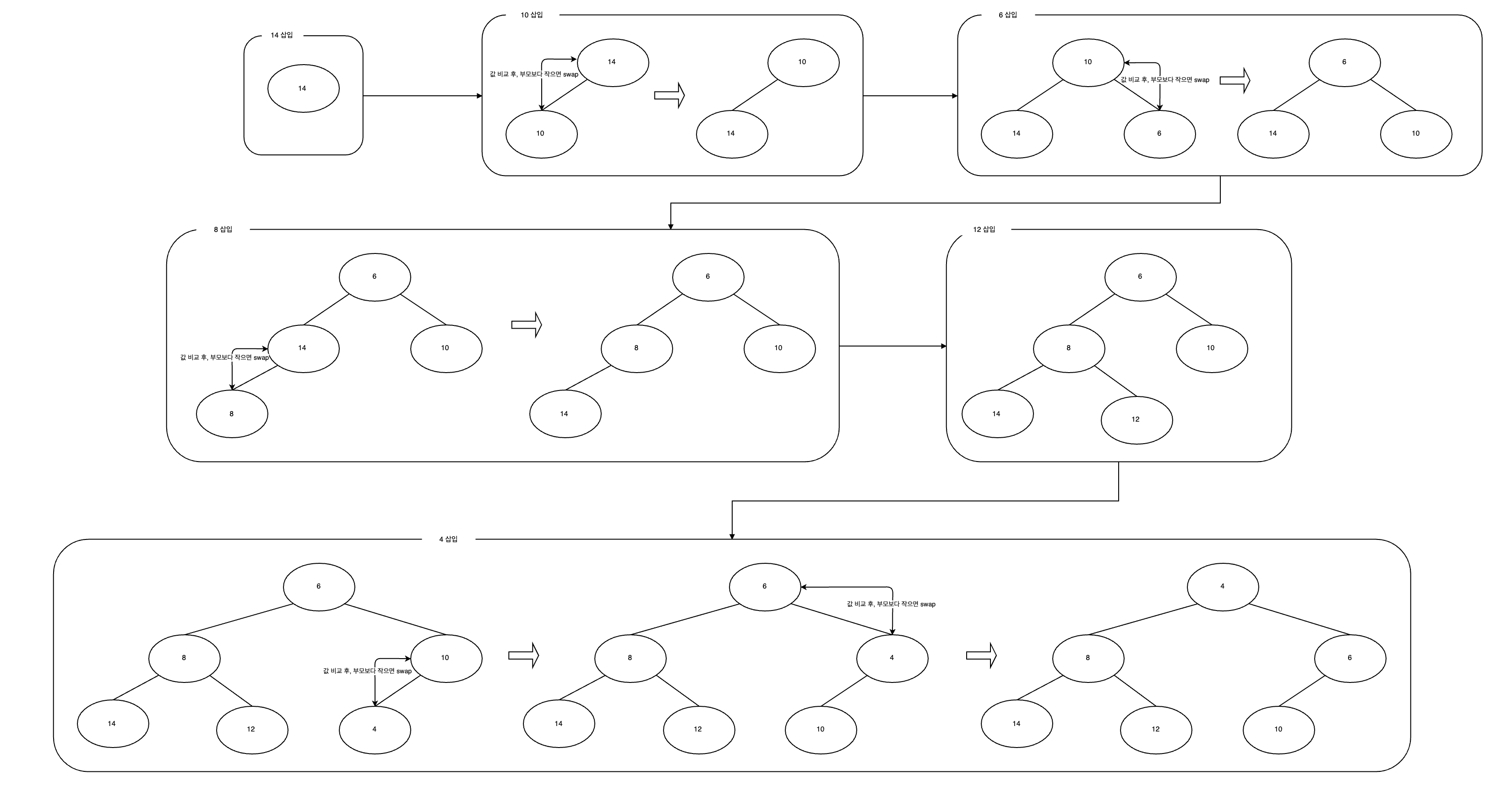 아래는 [14, 10, 6, 8, 12, 4] 의 데이터 순으로 삽입해 최소 힙을 구성하는 예시입니다.