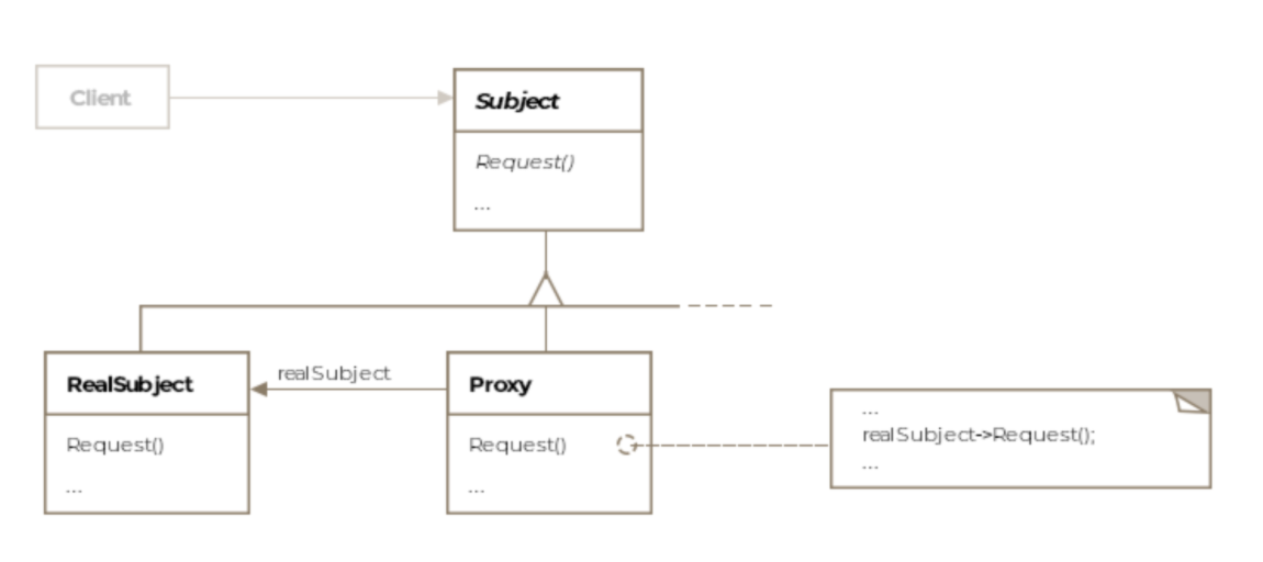프록시 패턴이란 프록시 의미 그대로 실제 기능을 수행하는 주체(RealSubject)를 바로 호출하는 대신 대리자(Proxy)를 거쳐서 호출하는 것입니다. 즉, 클라이언트 → 실제 기능을 담당하는 객체 가 아닌, 클라이언트 → 프록시 객체 → 실제 기능을 담당하는 객체의 흐름으로 진행됩니다.