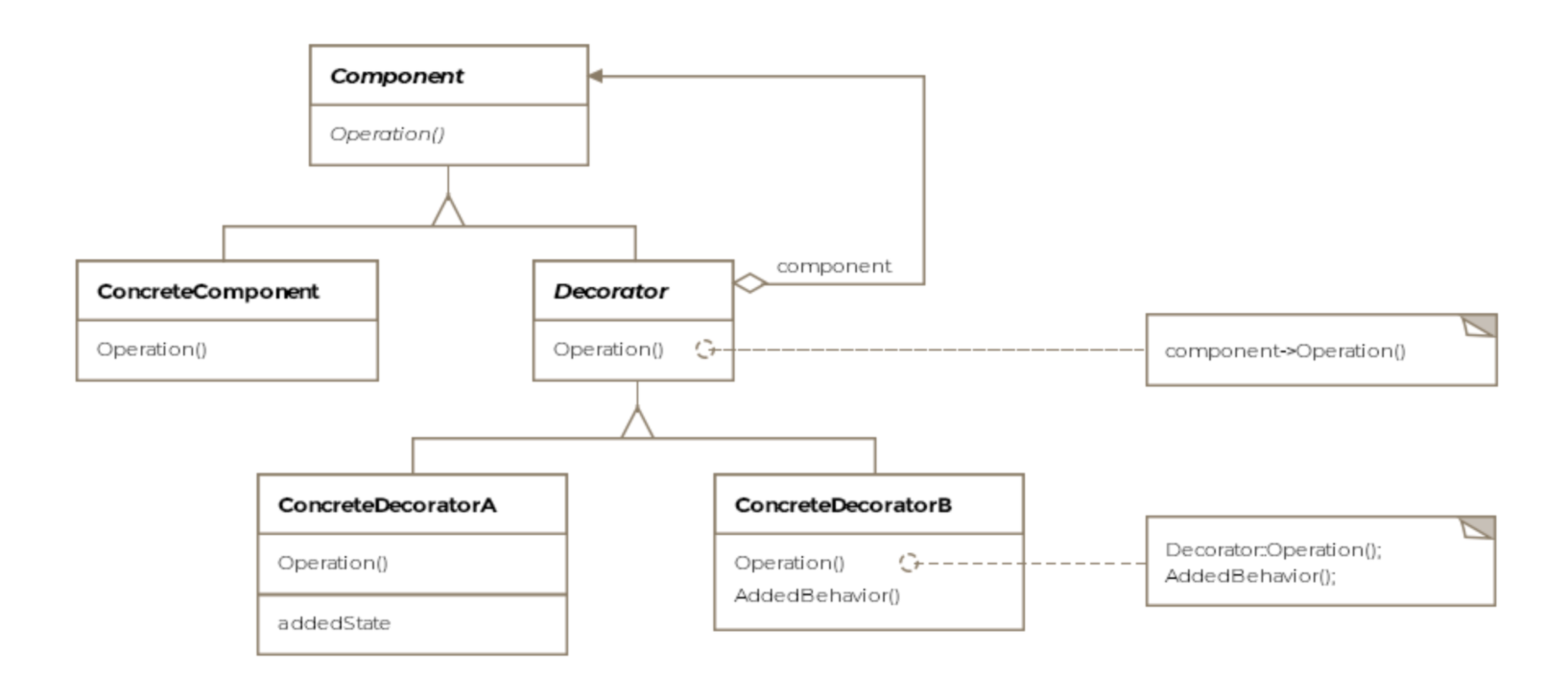 // Component public interface Beverage { int getCost(); String getTitle(); } // ConcreteComponent public class Americano implements Beverage { @Override public int getCost() { return 3000; } @Override public String getTitle() { return "아메리카노"; } } // ConcreteComponent public class HerbalTea implements Beverage { @Override public int getCost() { return 4000; } @Override public String getTitle() { return "허브티"; } } // Decorator public abstract class CondimentDecorator implements Beverage { private final Beverage beverage; public CondimentDecorator(Beverage beverage) { this.beverage = beverage; } @Override public int getCost() { return beverage.getCost(); } @Override public String getTitle() { return beverage.getTitle(); } } // ConcreteDecorator public class Sugar extends CondimentDecorator { public Sugar(Beverage beverage) { super(beverage); } @Override public int getCost() { return super.getCost() + 200; } @Override public String getTitle() { return super.getTitle() + " 설탕 추가"; } } // ConcreteDecorator public class Shot extends CondimentDecorator { public Shot(Beverage beverage) { super(beverage); } @Override public int getCost() { return super.getCost() + 500; } @Override public String getTitle() { return super.getTitle() + " 샷 추가"; } } Beverage americano = new Americano(); Beverage americanoOneShot = new Shot(americano); System.out.println(americanoOneShot.getCost()); System.out.println(americanoOneShot.getTitle()); // 3500 // 아메리카노 샷 추가 Beverage herbalTea = new HerbalTea(); Beverage herbalTeaOneSugar = new Sugar(herbalTea); System.out.println(herbalTeaOneSugar.getCost()); System.out.println(herbalTeaOneSugar.getTitle()); // 4200 // 허브티 설탕 추가파이썬