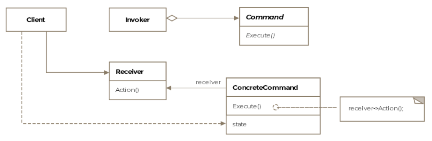 Receiver: ConcreteCommand에서 execute()를 구현할 때 필요한 클래스. ConcreteCommand의 기능을 실행하기 위해 사용하는 수신자 클래스. Client가 요청한 내용에 대해 액션만 취해주면 됨 (어떤 Client인지는 알 필요가 없다)