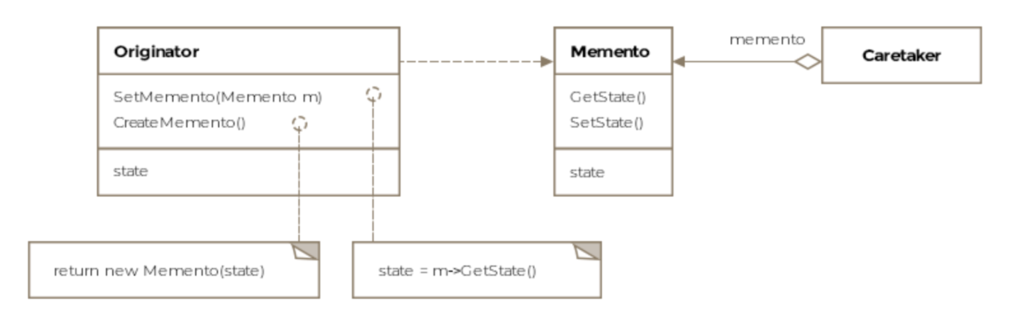 public class Memento { private final String state; public Memento(String state){ this.state = state; } public String getState(){ return state; } } public class Originator { private String state; public void setState(String state){ this.state = state; } public String getState(){ return state; } public Memento saveStateToMemento(){ return new Memento(state); } public void getStateFromMemento(Memento memento){ state = memento.getState(); } } public class CareTaker { private final List<Memento> mementoList = new ArrayList<>(); public void add(Memento state){ mementoList.add(state); } public Memento get(int index){ return mementoList.get(index); } } Originator originator = new Originator(); CareTaker careTaker = new CareTaker(); originator.setState("State #1"); originator.setState("State #2"); careTaker.add(originator.saveStateToMemento()); originator.setState("State #3"); careTaker.add(originator.saveStateToMemento()); originator.setState("State #4"); System.out.println("Current State: " + originator.getState()); originator.getStateFromMemento(careTaker.get(0)); System.out.println("First saved State: " + originator.getState()); originator.getStateFromMemento(careTaker.get(1)); System.out.println("Second saved State: " + originator.getState()); // Current State: State #4 // First saved State: State #2 // Second saved State: State #3파이썬