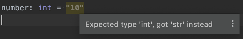 # from typing number: int = 1 name: str = '가나다'만약 타입에 맞지 않는 값이 들어온다면 ide(pycharm 기준)에서는 아래와 같이 warning을 띄워줍니다.