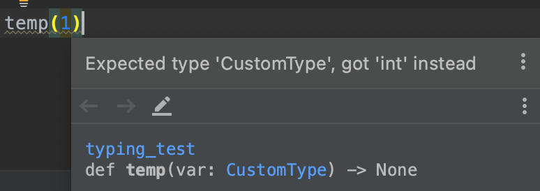 from typing import NewType CustomType = NewType('CustomType', int) def temp(var: CustomType): print(var) print(type(var)) # 1 # <class 'int'> num = CustomType(1) temp(num)여기서 int 타입을 전달하면 warning을 볼 수 있습니다.