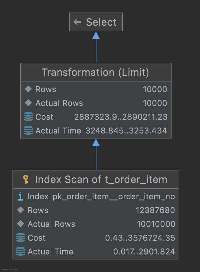 SELECT * FROM orders as p inner JOIN ( SELECT orders_id FROM orders LIMIT 10000 offset 10000000 ) AS t ON p.orders_id = t.orders_id;