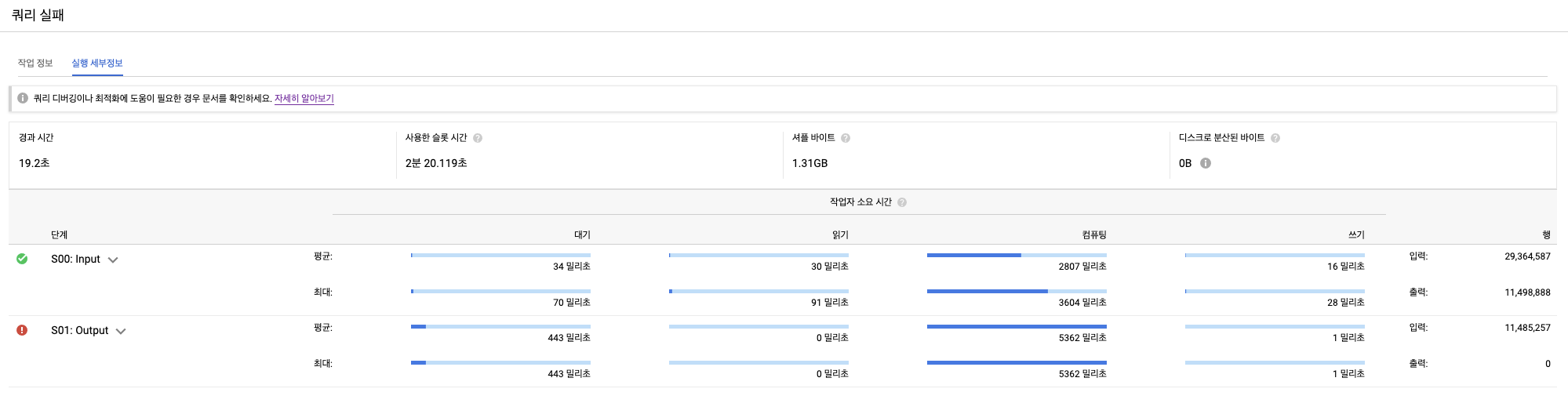 S00: INPUT의 경우, ORDER BY를 처리하지 않고 WHERE 절만 처리한 다음, 단계를 넘기는 것을 볼 수 있습니다.READ: $1:image_id, $2:item_id, $3:image_type, $4:url, $5:with, $6:height, $7:is_deleted FROM 테이블 WHERE and(equal($3, 'TITLE'), equal($7, false)) WRITE: $1, $2, $3, $4, $5, $6 TO __stage00_output다음 실패한