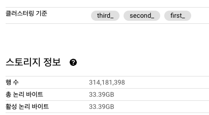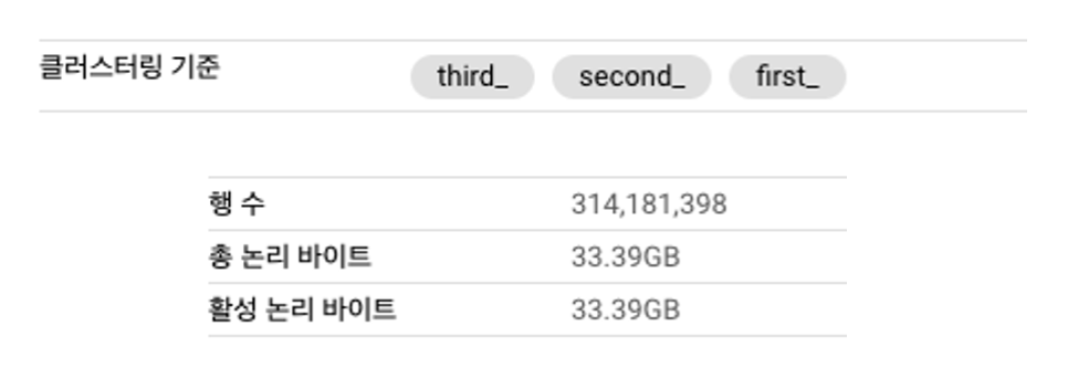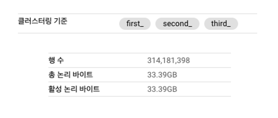 first_를 제거한 테스트입니다.SELECT * FROM `{프로젝트}.{데이터셋}.clustering_test_first` where second_ = 11471 and third_ = 'F' -- 158건 출력