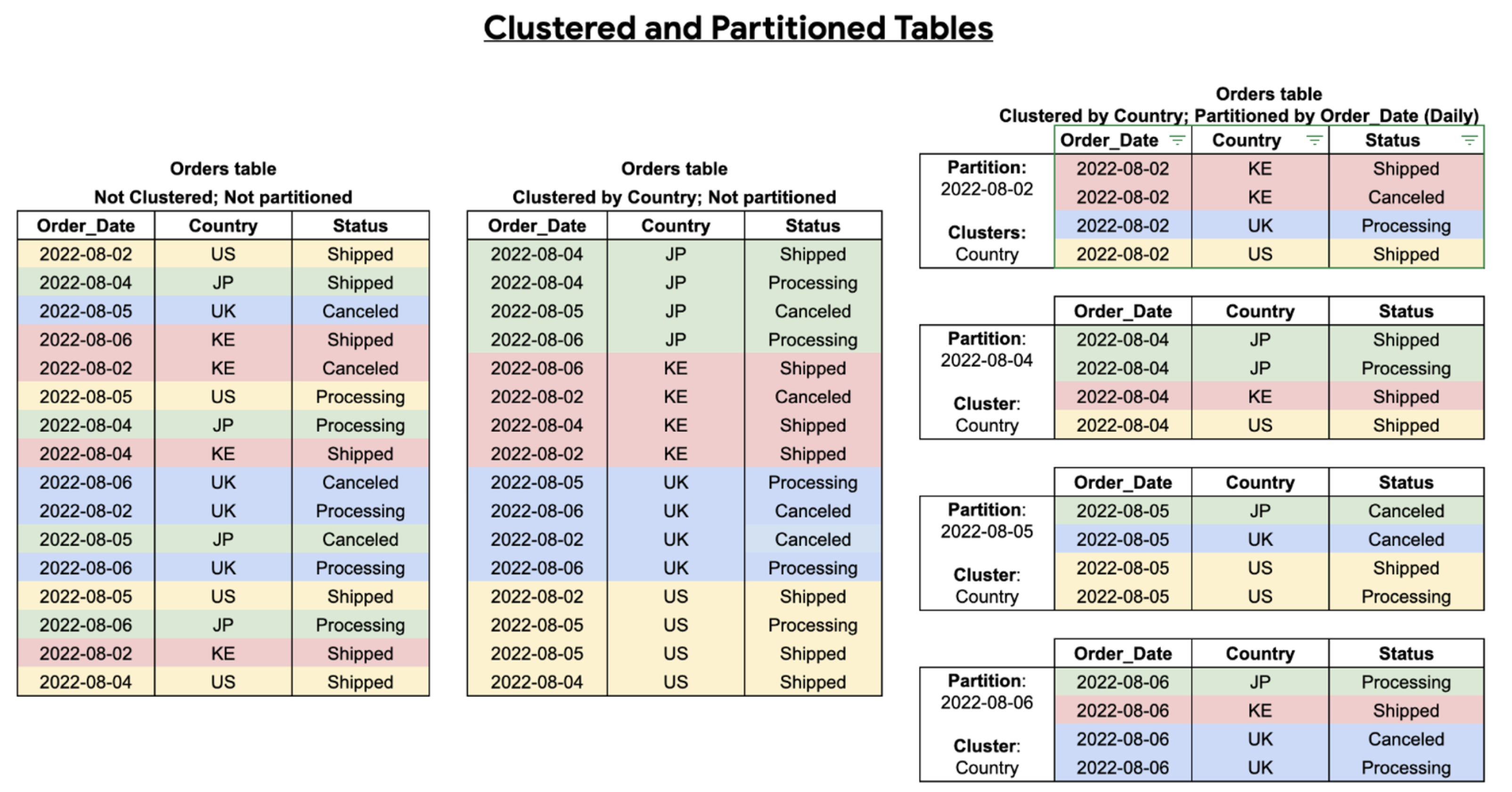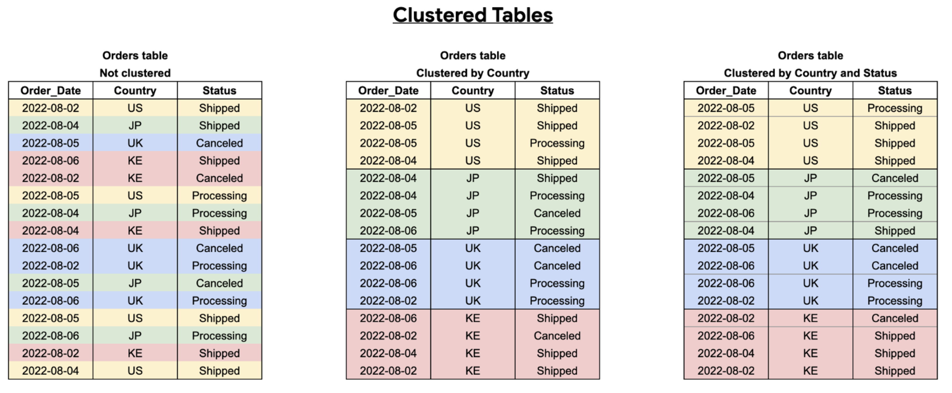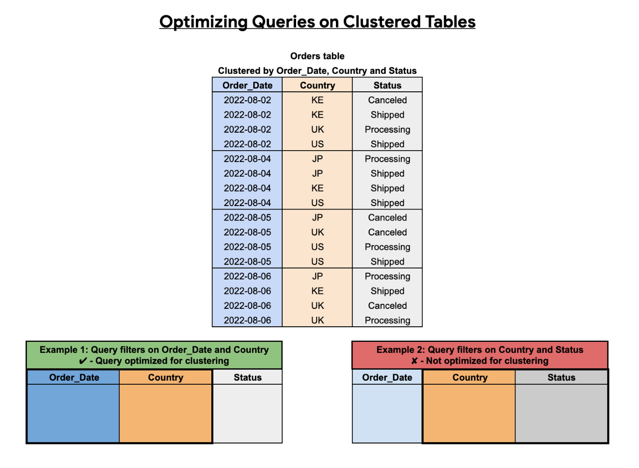 Order_Date,CountryStatus의 순서로 클러스터링이 되어 있는 테이블에서 및 를 필터링하는 쿼리는 클러스터링에 최적화되어 있지만 만 필터링하는 쿼리는 최적화되지 않습니다. 클러스터링 결과를 최적화하려면 첫 번째 클러스터링된 컬럼부터 순서대로 클러스터링된 컬럼을 필터링해야 합니다.