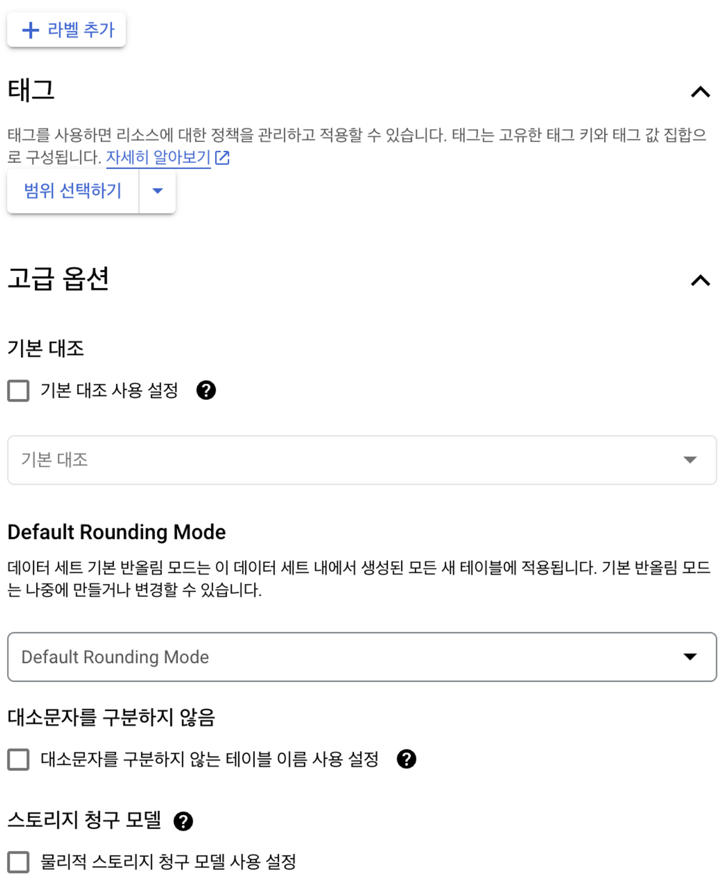 변환은 쿼리도 존재하지만 빅쿼리 콘솔에서 간편하게 변경할 수 있습니다. 데이터셋의 세부정보 수정을 누른 후, 고급 옵션을 열면 하단에 스토리지 청구 모델을 변경할 수 있습니다.