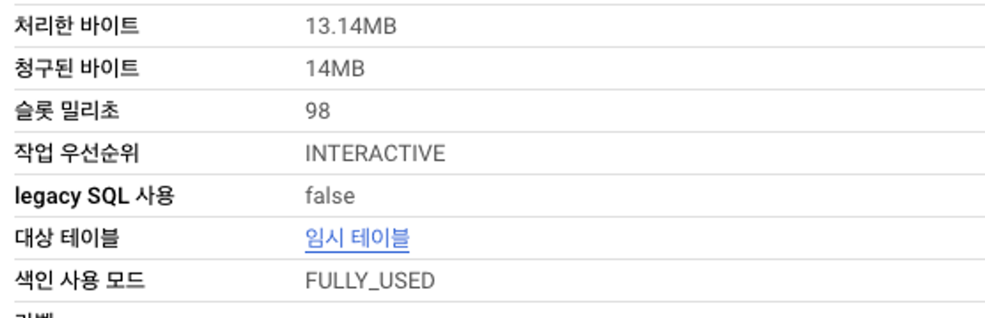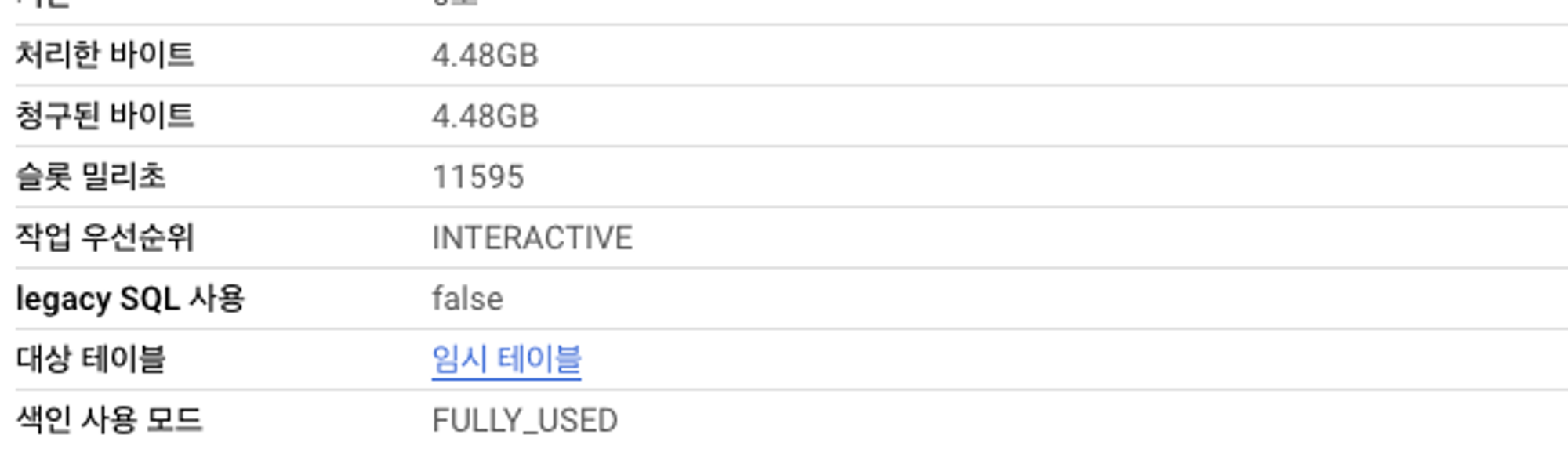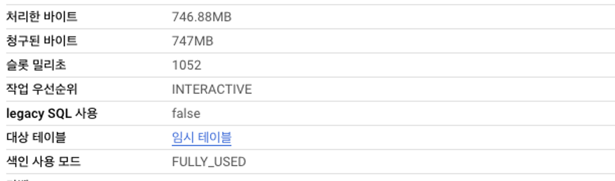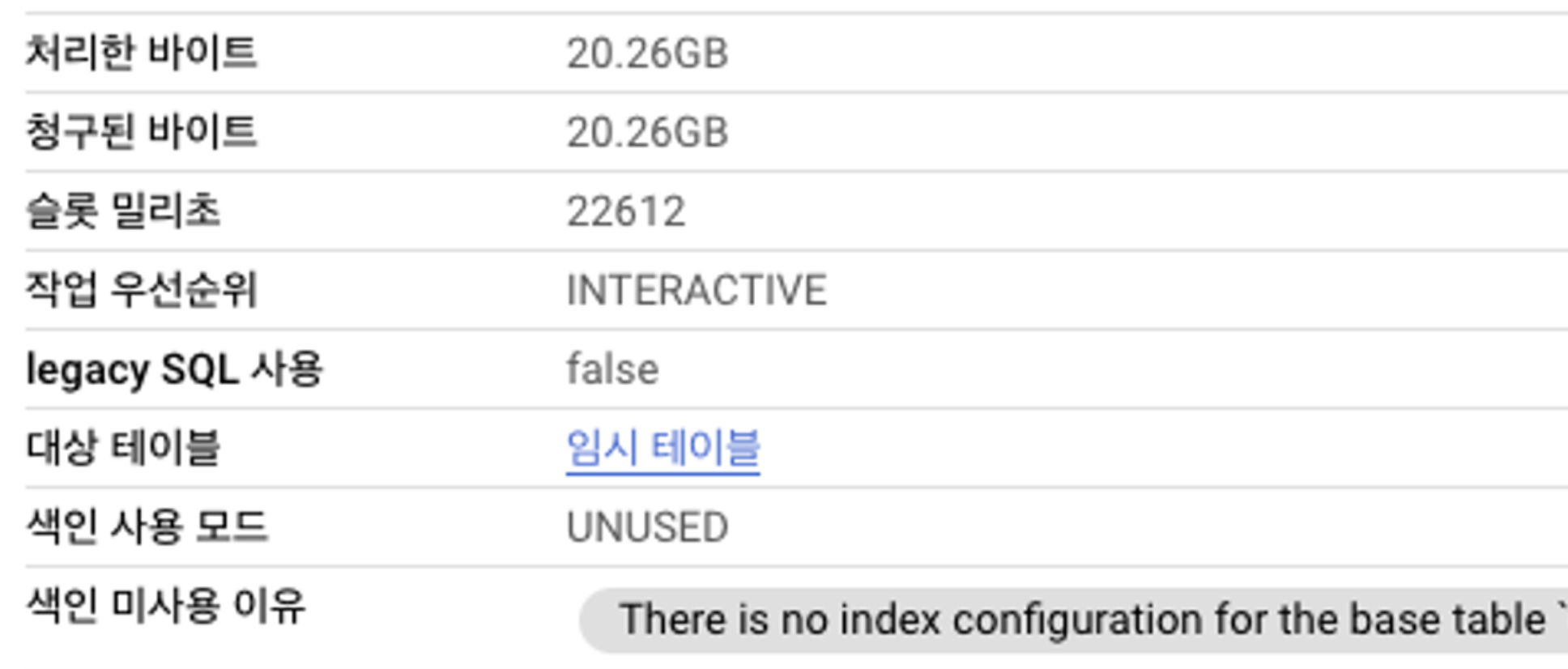 검색 색인 사용, 미사용은 호출 후 다음과 같은 빅쿼리 콘솔에서