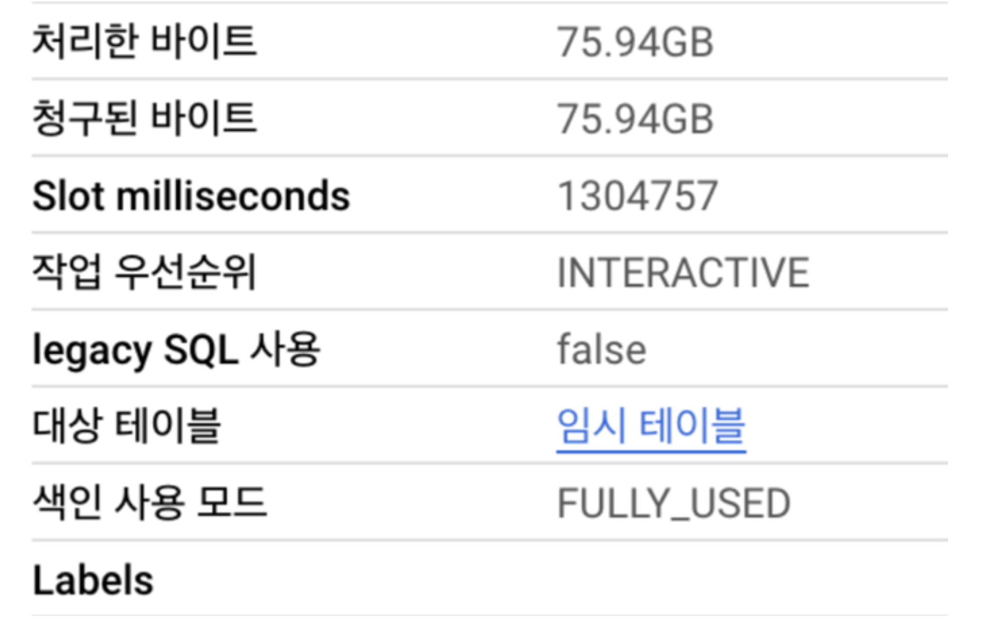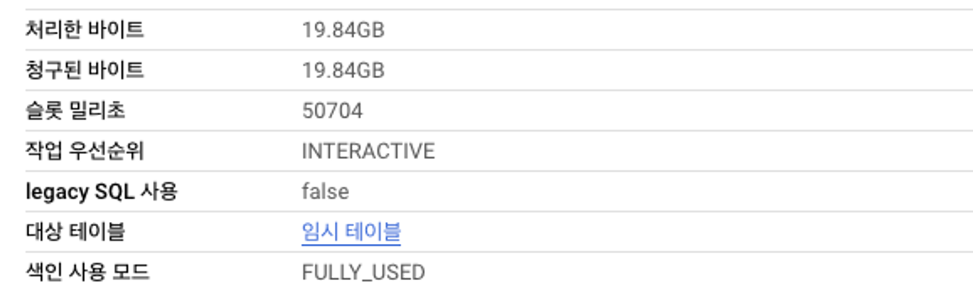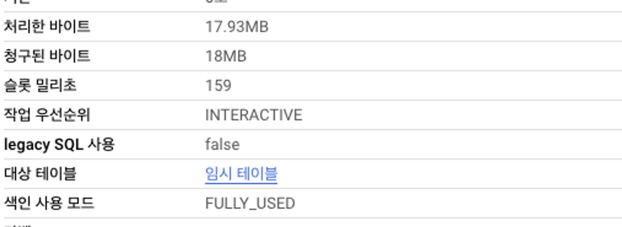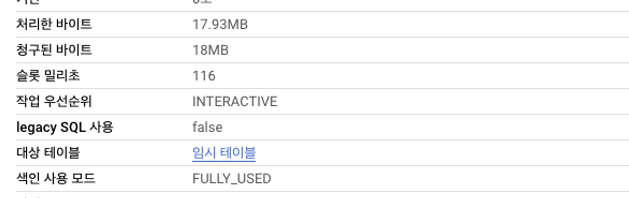검색 색인 사용, 미사용은 호출 후 다음과 같은 빅쿼리 콘솔에서