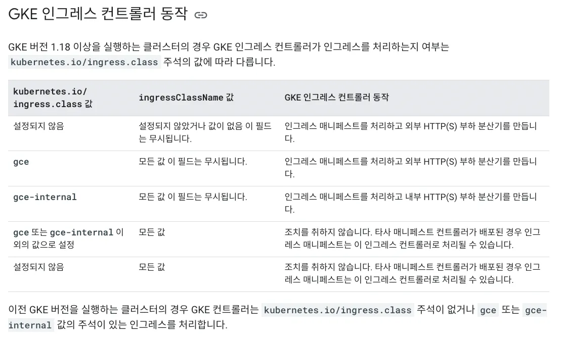 ingressClassName필드를 명시하지 않으면 GKE는 다음과 같은 방식으로 트래픽을 처리합니다.- 기본 IngressClass 사용: GKE 클러스터에는 기본 IngressClass가 자동으로 생성되어 있습니다. 이 IngressClass는 Google Cloud HTTP(S) Load Balancer를 사용하도록 구성되어 있습니다.
