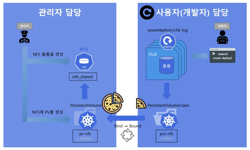 - 사용자: PVC를 생성하여 원하는 스토리지 크기, 접근 모드, StorageClass를 요청합니다.