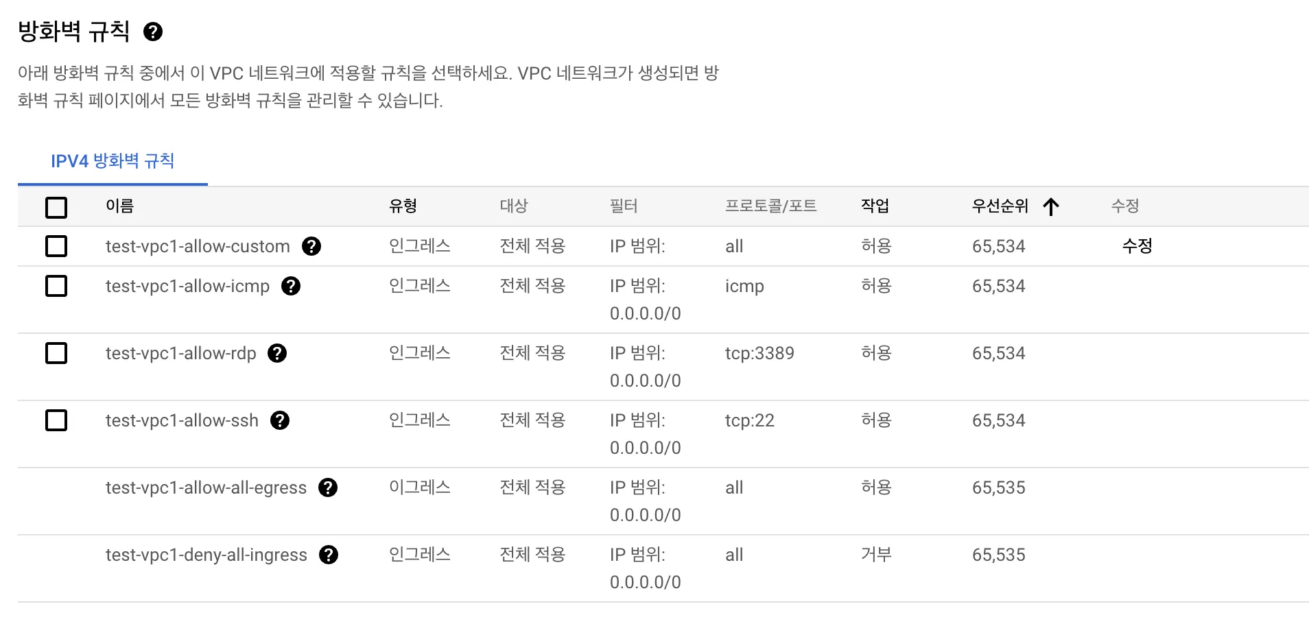 기본적으로 제공해주는 방화벽을 선택해 vpc에 추가할 수 있습니다. 만약 아무것도 선택하지 않았으면 방화벽 규칙은 비어있을텐데 이럴 경우, 모든 IP와 포트에 대해 접근 거부가 적용됩니다.